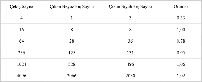 Teorik olarak her çekişte çıkan siyah ve beyaz fişlerin sayısının eşit olması gerekir. Ancak düşük miktarda çekim yapıldığı zaman normal şartlarda olan eşitlik durumu, tesadüfi sebeplerden dolayı kestirilemez bir orana yaklaşmaktadır. Oysa fiş sayıları eşit olmasa bile çekiş miktarı fazla olduğu zaman birbirlerine oranın 1’e yaklaştığını görüyoruz.
